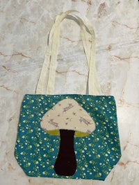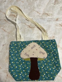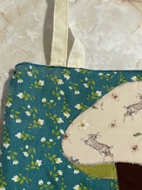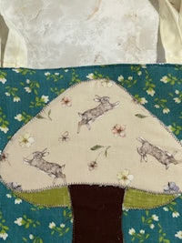 Adorable floral print and bunny print mushroom made from repurposed, placemats, fabric scraps and curtains!
