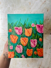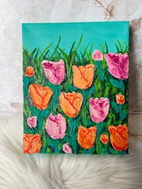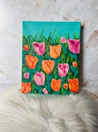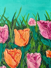 Bold pink and orange highly textured tulips painted with just a palette knife.