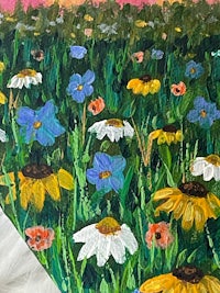 Warm pink, orange and yellow fluffy clouds with iridescent highlights and a colorful wildflower field!