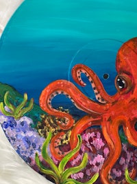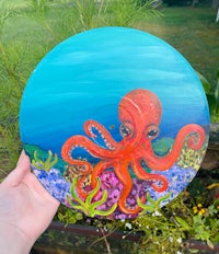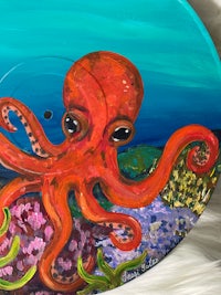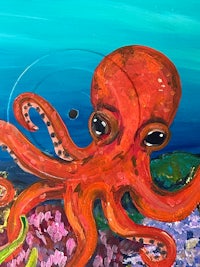 A bold, bright, and warm octopus with his colorful coral reef full of fun textures and lime green seaweed!
