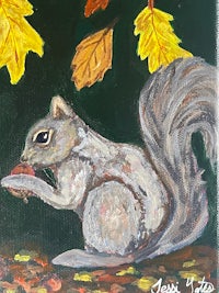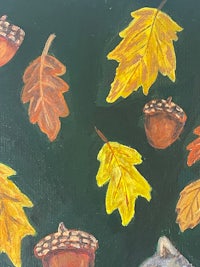 A cute fluffy little squirrel having an acorn snack amongst the fall leaves. Acrylic paint on