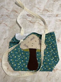 Adorable floral print and bunny print mushroom made from repurposed, placemats, fabric scraps and curtains!