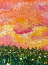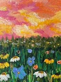 Warm pink, orange and yellow fluffy clouds with iridescent highlights and a colorful wildflower field!