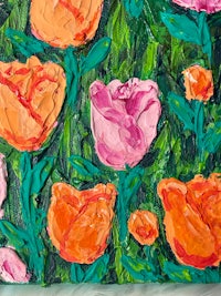 Bold pink and orange highly textured tulips painted with just a palette knife.