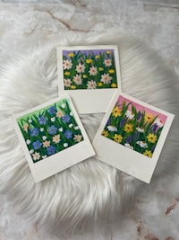 I created fun little paintings inspired by Polaroids! I hand paint these with acrylic paint on thick watercolor paper and they’re about 3.5” x 4”